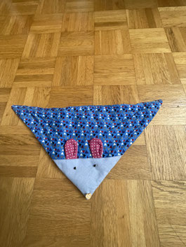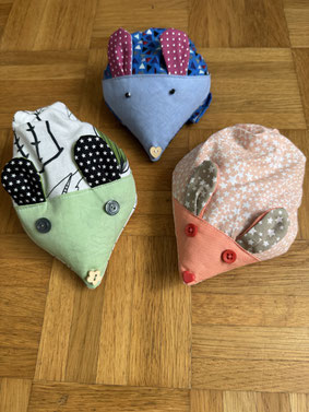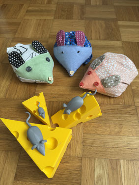 Die Mäuse sind ein 3- Eck, welches man zusammenknoten kann und dann die Maus Form hat. So lässt sich die Maus auch als Steinkissen brauchen.
